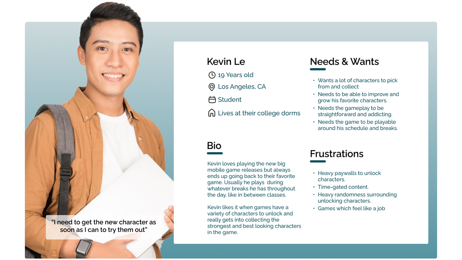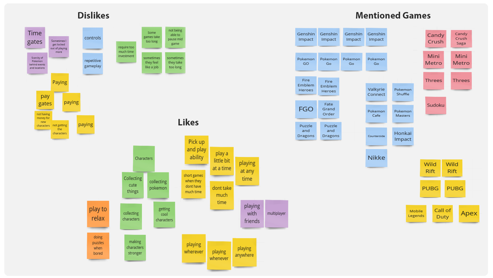 The initial interviews gave the project a good starting point into understanding the users that might interact without Alignimals. Three personas, representing three distinct types of users, were thus created, influenced by the affinity diagram in order to better cement and personify the different types of users, their use cases, issues, and desires. The three categories of users I ended up on were: casual players, dedicated collectors, and competitive players.