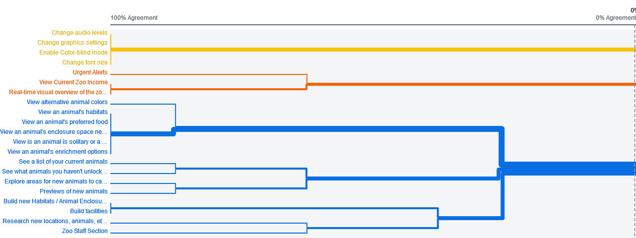 A remote open card sort was conducted with 16 initial participants using OptimalWorkshop. The goal of this card sort was to start collecting information for the creation of the initial information architecture as well as better understand the potential terminology I could use for menus and buttons. Users were given cards describing various features of the game decided through the competitive analysis and initial interviews. Below is a dendrogram created using the information collected from this card sort displaying the best merge methods for the content which was planned to be included.