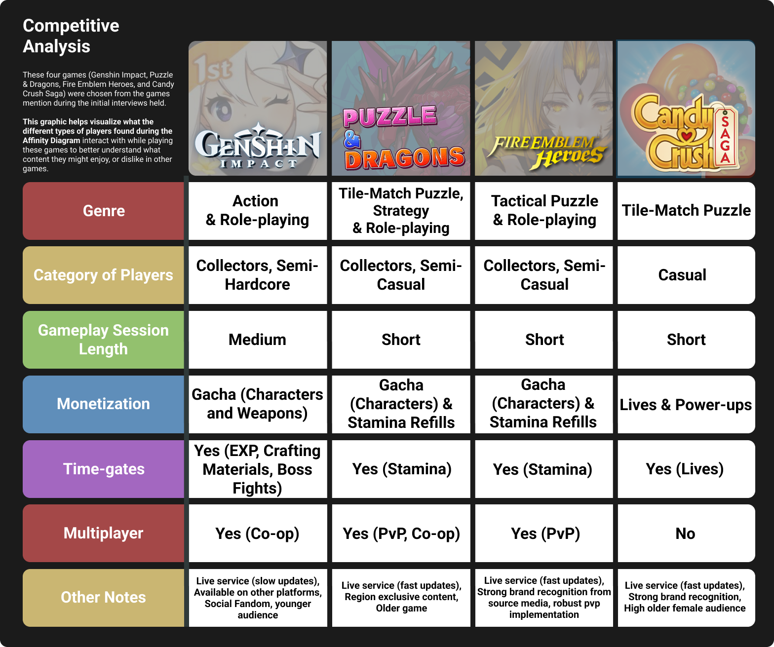 A competitive analysis was also done in order to gain a better understanding of the games that the participants in the initial interview mentioned by name. Doing this allowed even further visualization of the information observed during the affinity diagram. The chart allowed an at-a-glance understanding of the types of content the interview participants interacted with in other similar games. This information acted as a great starting point for the type of content Alignimals might want to incorporate into its experience, in essence, taking the best parts of other popular games.