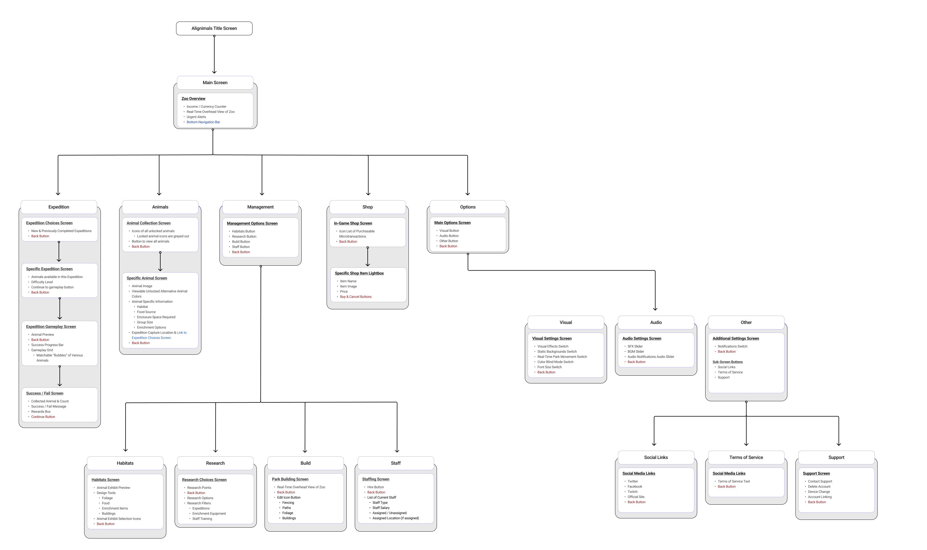 The revised information architecture integrated insights from the card sort and tree test, along with smaller refinements such as simplifying section names (e.g., renaming “Animal Exploration” to “Exploration”). The diagram was also expanded to better represent deeper navigation levels and their associated features. Additional updates included introducing a Shop section and integrating the “Your Collection” area into the “Animal Info” section. In the diagram, blue highlights indicate interactions that lead to deeper pages, while red highlights represent actions that return users to previous sections, either via a back button or task completion.