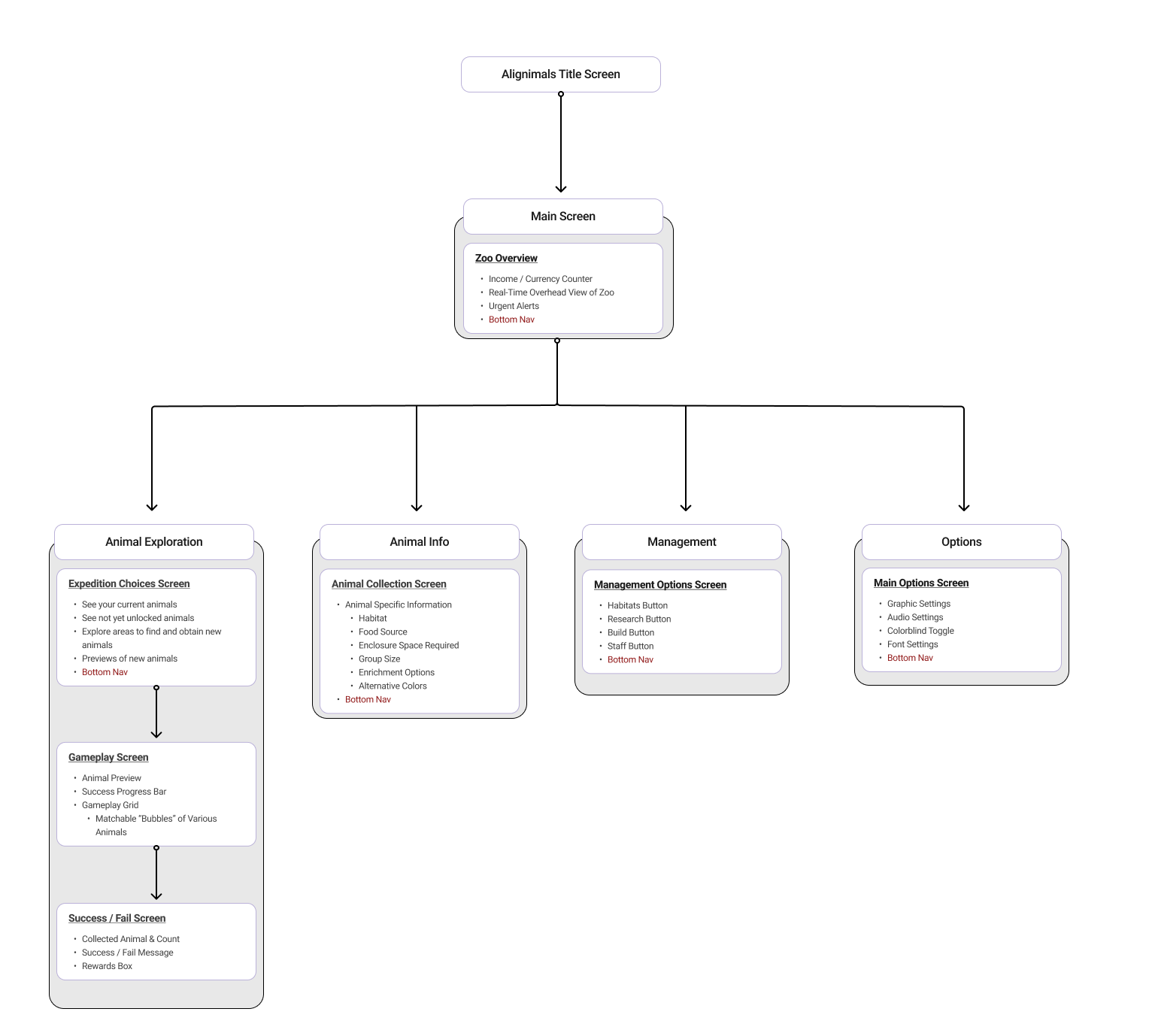 With the information on what content users expected, where they expected it, and what content they tended to group together, an initial information architecture could now be created to plan out the structure of the app, the connections within it, and titles for screens. This initial work was made with the understanding that it was not final, not perfect, and expected to be iterated on. However, the benefits of this work came to fruition during the created of the initial wireframes and for the tree test as it allowed for a solid foundational structure to test upon.