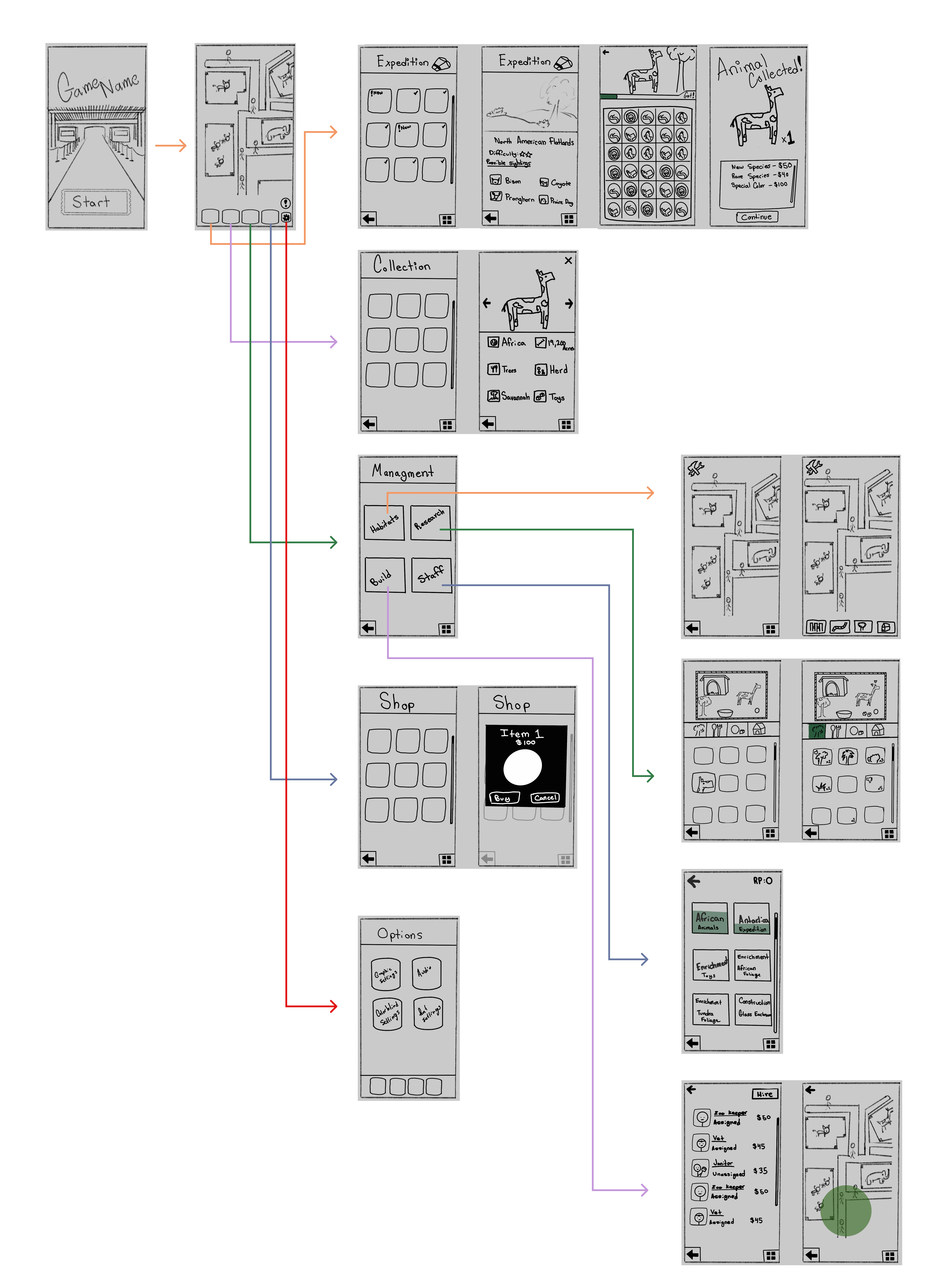 Using all the information collected thus far, from the interviews, to the information architecture molded by the card sort, initial low-fidelity wireframes were created through multiple iterations to visualize the initial design and navigation thus far. The image below was the low-fidelity wireframes that were ended on, they kept the structure simple and the navigation seemed easiest for users to move through. Inspiration was taken from various other mobile games mentioned in the initial interviews, most notably the UI organization and placement.