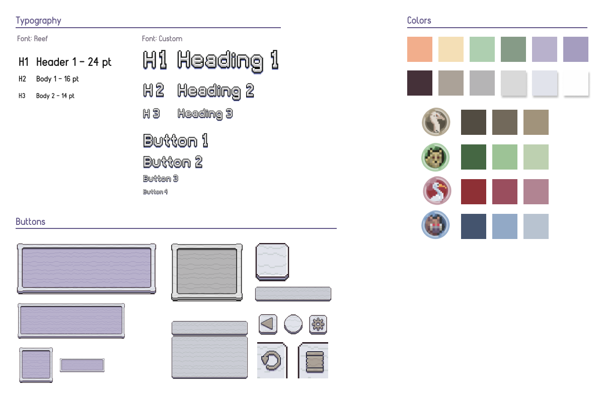 To support consistency and scalability, a foundational design system was established for the project. This system defines the core visual language, including color palette, typography, and key UI elements such as frames, borders, containers, and icons. The design system serves as a reference for the current prototype and provides a flexible framework that can be expanded on, ensuring visual cohesion across future features and screens.