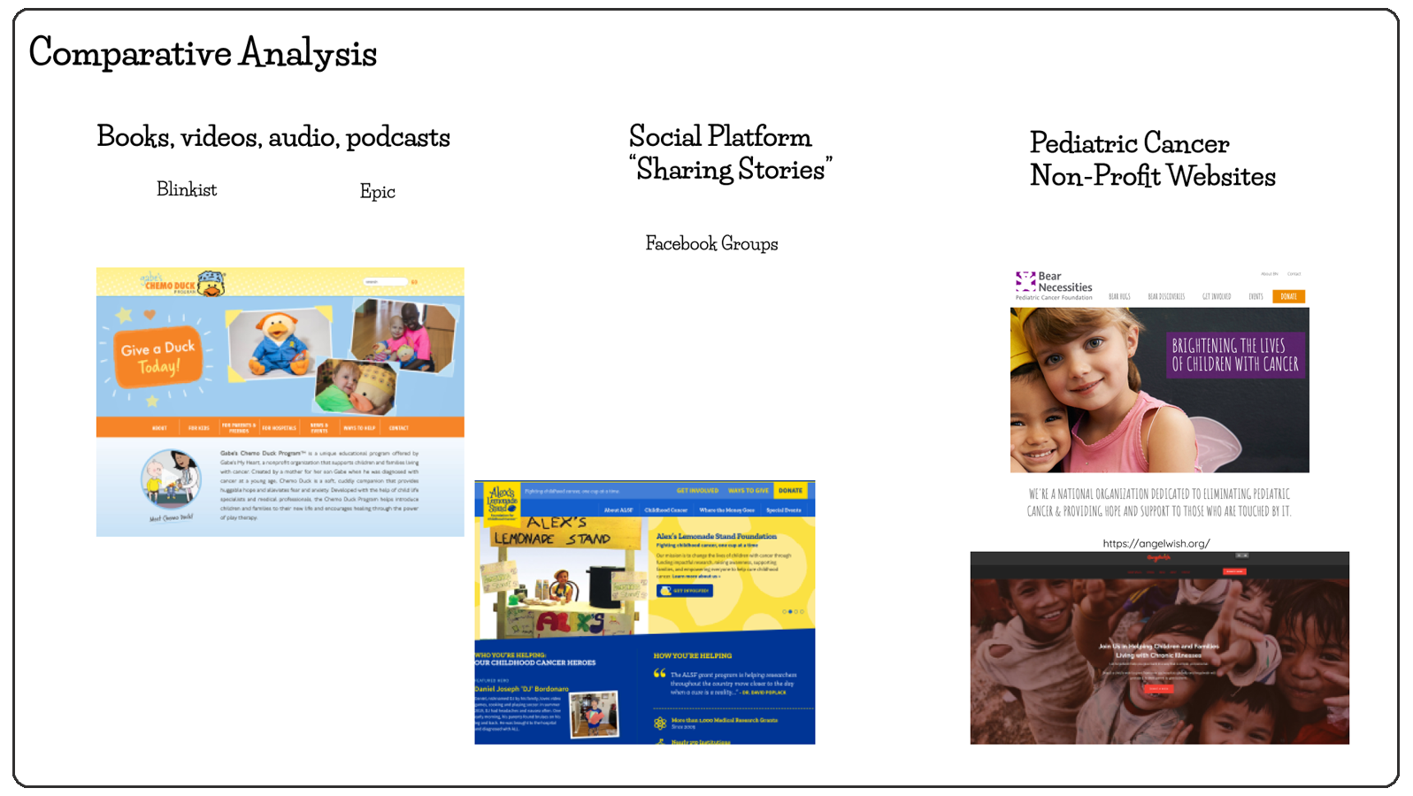 We took a look at dozens of examples of similar website and organizations, and ultimately narrowed down our focus to four organizations who we thought were the most similar to Love Smiles. We used these websites, alongside the information we gathered from the founder, to assist us in creative a rough list of features that we felt were required for such a website and color coded them so that we could focus on those which felt were more important.